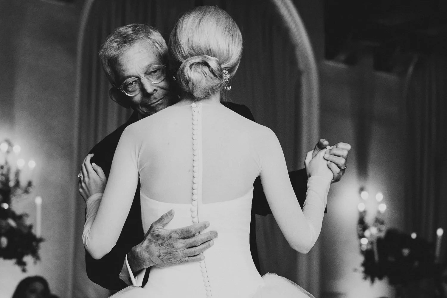 The bride shares a heartfelt dance with her father at their wedding reception in the elegant St. Regis Hall in Washington, DC.